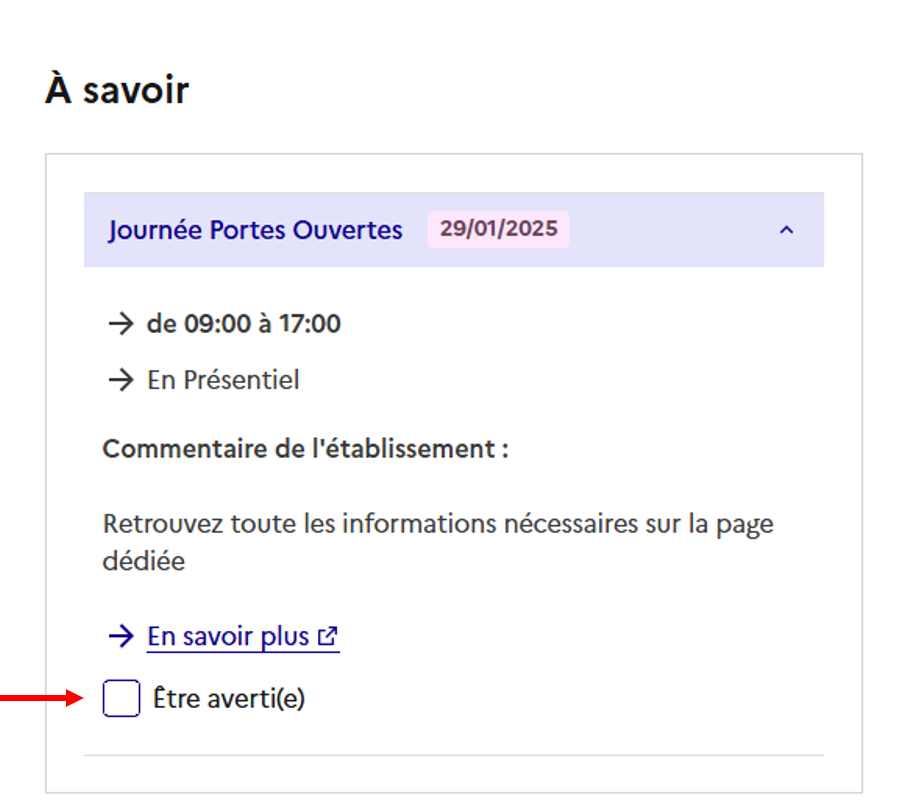 Les dates des journées portes ouvertes ou journées d’immersion sont précisées pour chaque formation dans leur fiche de présentation Parcoursup. Vos élèves peuvent depuis la fiche activer une alerte pour ne pas oublier la date des JPO de leur formation favorite.