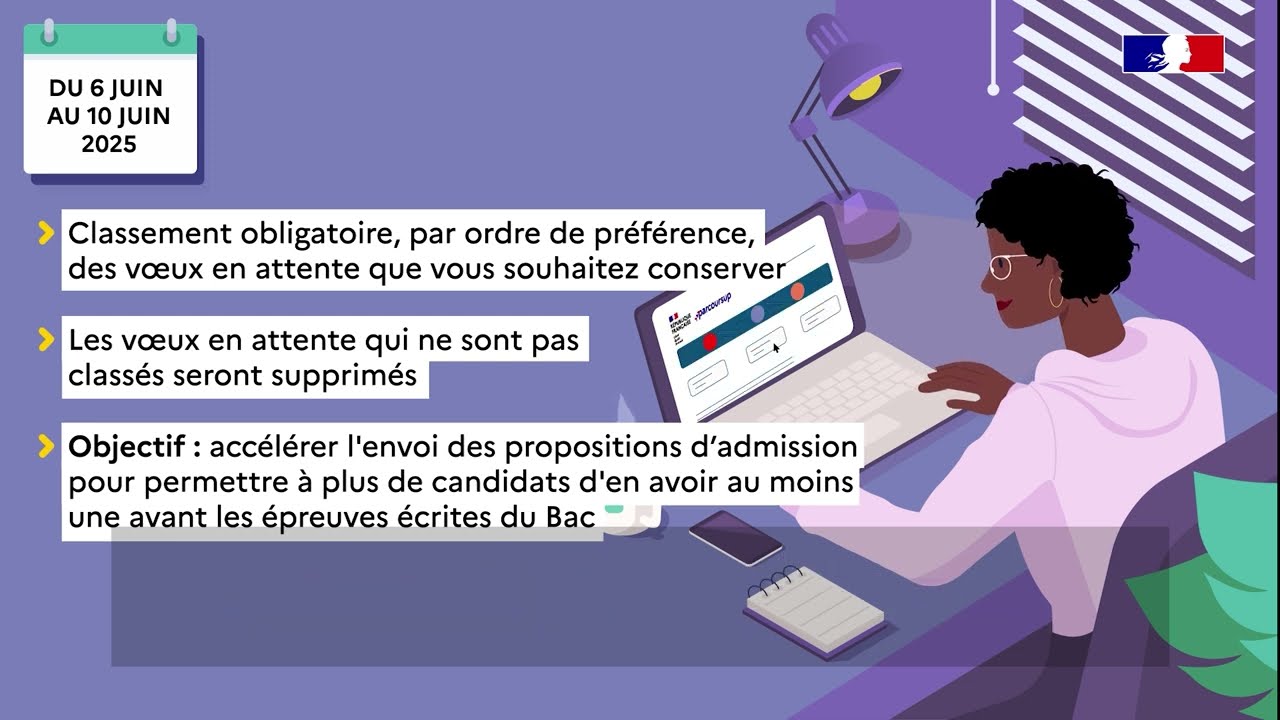 A partir du 6 juin 2025 débute une nouvelle étape le classement des vœux en attente de la phase principale. Vos élèves ayant des vœux en attente doivent les classer par ordre de préférence avant le 10 juin 2025 inclus.